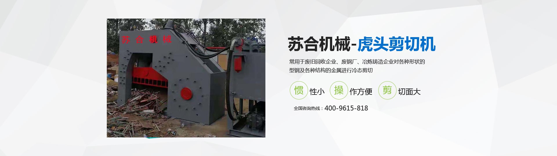 虎頭剪具有體積小、重量輕、慣性小、噪音低、動作平穩(wěn)、操作方便、靈活、剪切斷面大、剪刀口調(diào)整方便等優(yōu)點(diǎn),操作使用安全。常用于廢舊回收企業(yè)、廢鋼廠、冶煉鑄造企業(yè)對各種形狀的型鋼及各種結(jié)構(gòu)的金屬進(jìn)行冷態(tài)剪切。剪切機(jī)的用途就是用來剪切定尺、切頭、切尾、切邊、切試樣及切除軋件的局部缺陷等。 滑縣蘇合機(jī)械制造有限公司性能穩(wěn)定,操作簡單。歡迎來電咨詢 <了解更多>